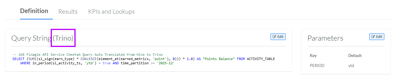 If you have a Query with both a Hive and a Trino Execution Type defined, only one Execution Type can be selected at a time. The selected Execution Type will be the one utilized when the Query executes. You can identify the currently selected Execution Type by looking in the Query String section of the Definition tab on the Query Details screen.