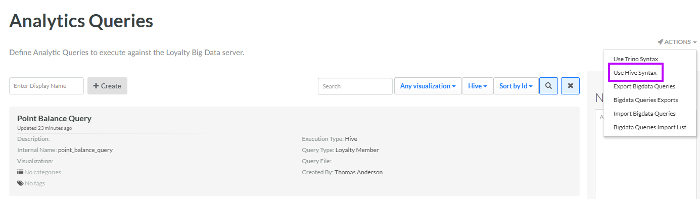 2. From the Action menu, select Use Hive Syntax. A confirmation dialog box is displayed; click Confirm.