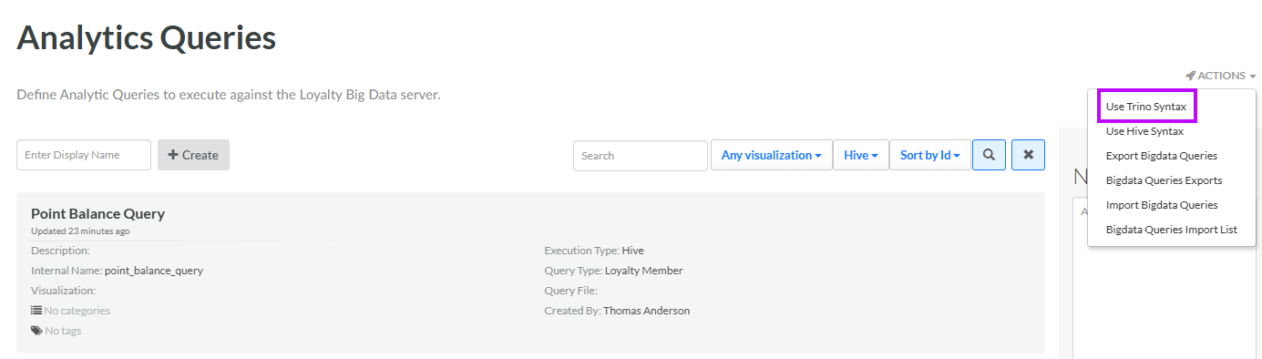 Note: This feature will impact only Queries that have both a Hive and a Trino syntax version defined. Trino Queries without a Hive syntax version, as well as other Execution Types (such as SQL or Spark), are not impacted.