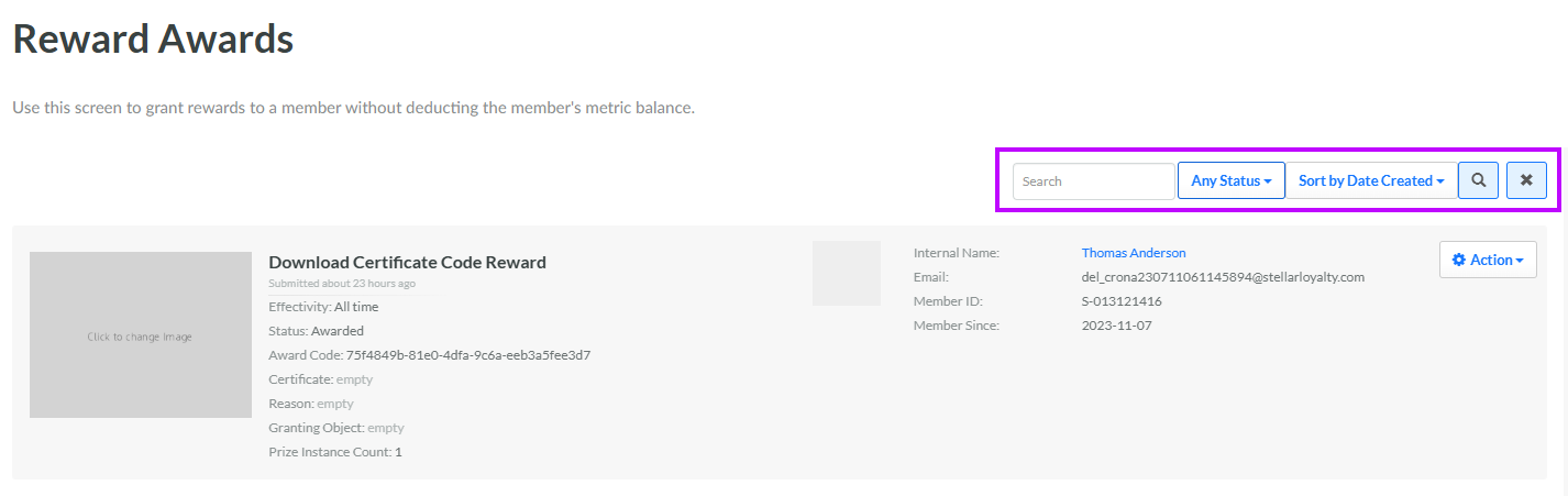 The search feature on the Awards screen allows you to search for a specified text string anywhere within the name of the associated Reward, the Member name, or the Member email address. You can also filter the Awards screen to show only Awards with a specified status.
