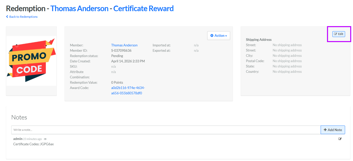For Rewards of type Physical Product, the Redemption can be used to store the Member's shipping address. You can also use the Redemption fulfillment status to track the progress of the shipment (see Change Fulfillment Status for more information).