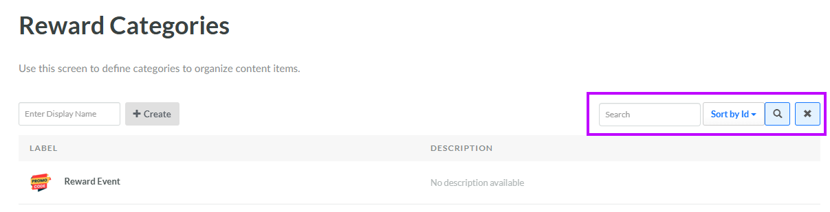 2. Optionally, enter a search string in the Search field. You can search for Reward Categories based on their Display Name or Internal Name. Click the Search icon. The screen is refreshed to show only the Reward Categories that meet your search criteria.