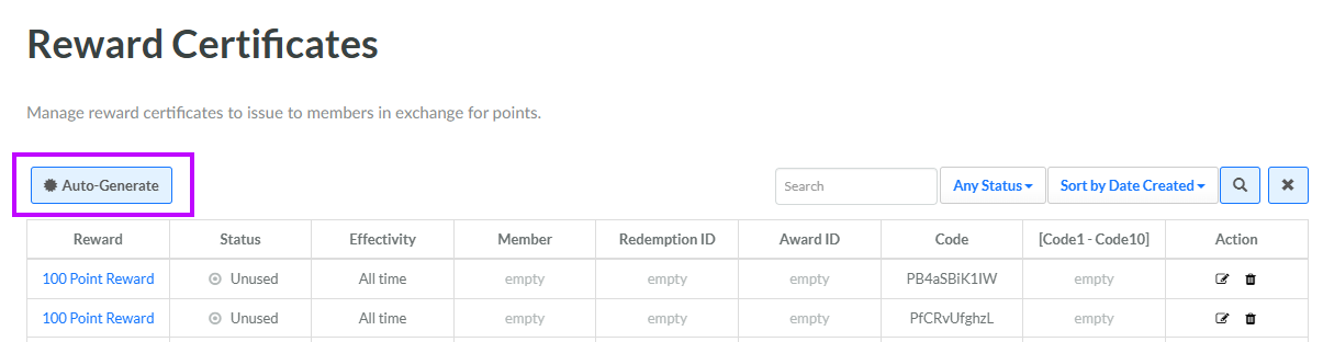 Note: You can also auto-generate Reward certificate codes from the Reward Details screen if viewing a Certificate-type Reward. When generated from the Reward Details screen, the certificate codes will automatically be assigned to the currently selected Reward. See Auto-Generate Reward Certificate Codes for more information.