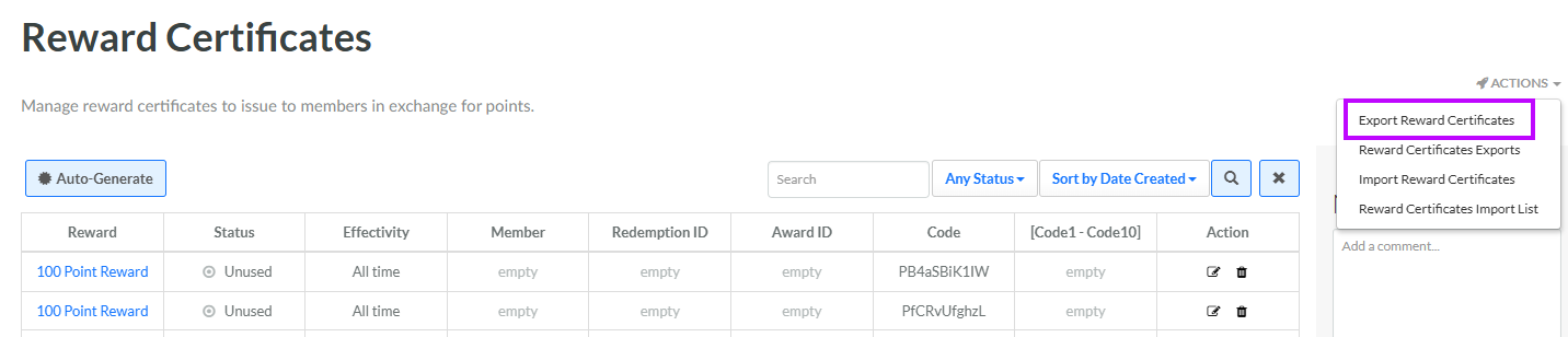 2. From the Actions drop-down menu, select Export Reward Certificates. The Create New Export pop-up window is displayed.