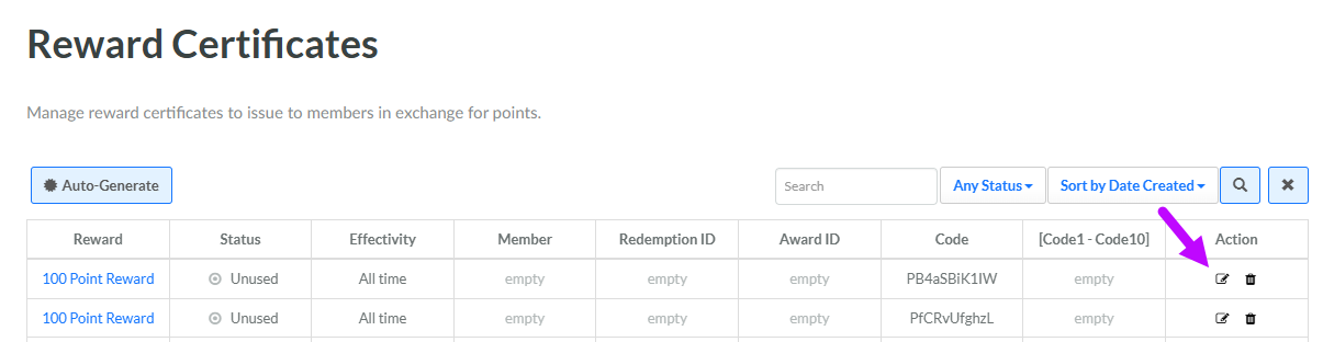 Edit a Reward Certificate Code