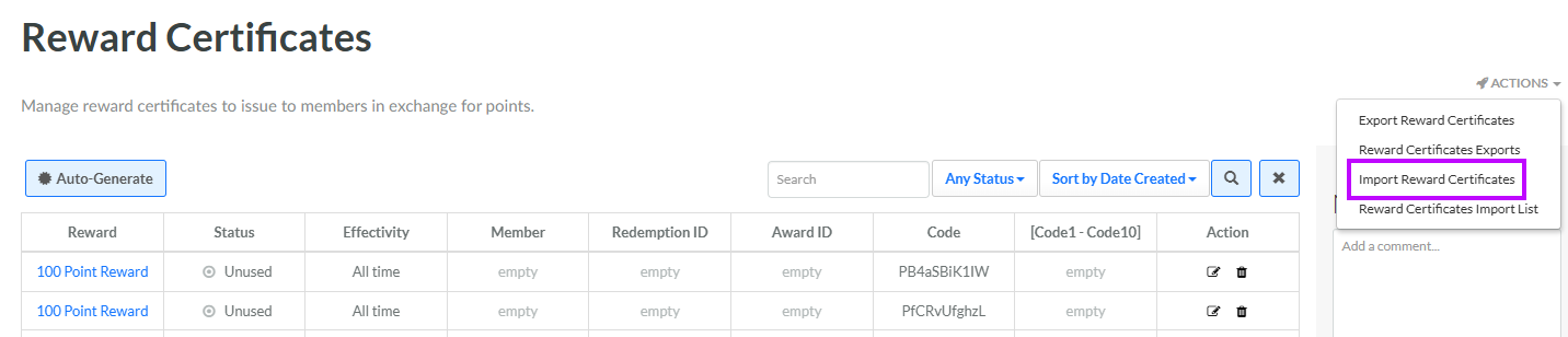 1. From the Actions drop-down menu, select Import Reward Certificates. The Create New Import pop-up window is displayed.