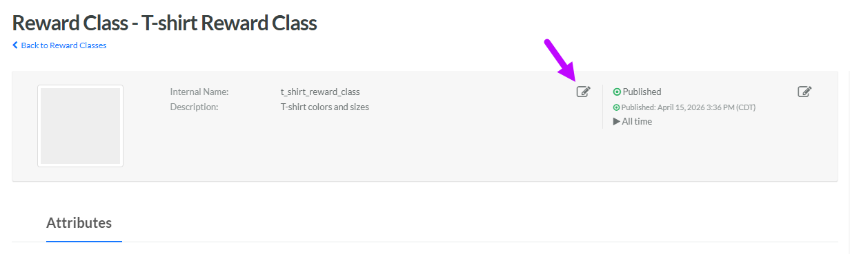 2. Search for and select the desired Reward Class (see Search for a Reward Class for more information on the available search options). The Reward Class Details screen is displayed, with the Attributes tab selected by default.