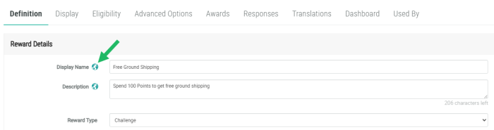 The Loyalty platform supports the use of content that has been translated into other languages. Specific Reward fields (marked by a globe icon) allow you to enter this localized content in different languages. For example, when entering the Reward Details on the Definition tab, the Display Name and Description fields are marked with the globe icon, indicating that they support multiple languages. In addition, the Content Editor also supports the use of localized versions of Reward content.