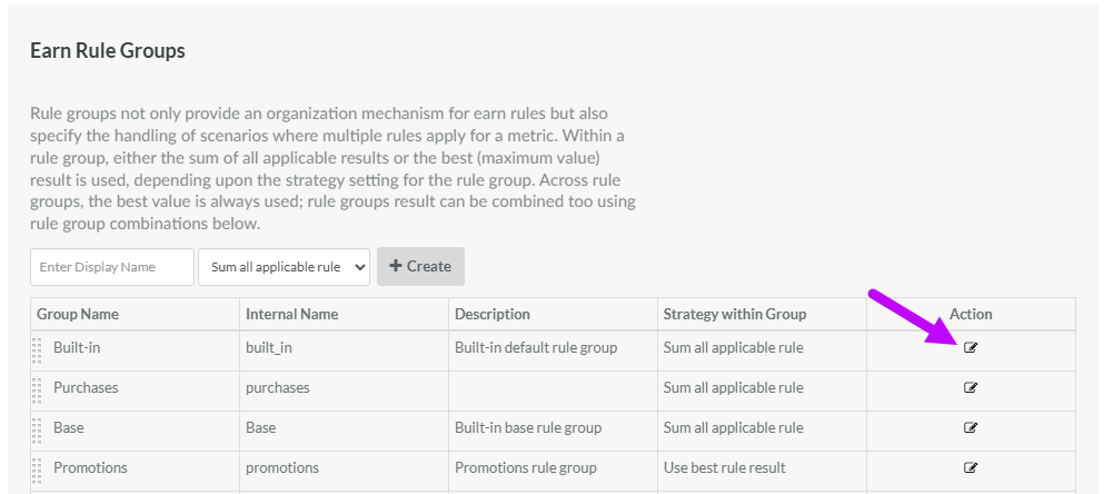 Within the Earn Rule Groups section of the screen, the platform displays a table of all the existing Earn Rule Groups, showing their Display Name, Internal Name, description, and strategy. In the Action column of the desired Earn Rule Group, click the Edit icon. The Rules Group pop-up window is displayed.
