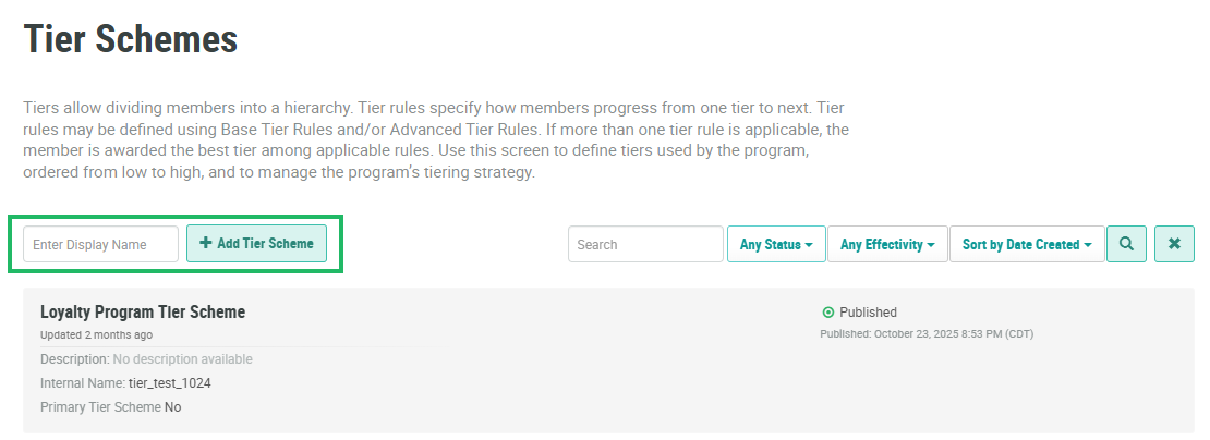 Select Rules from the top navigation bar, then select Tier Schemes from the side navigation menu. The Tier Schemes screen is displayed.