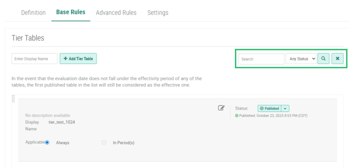 A single Tier Scheme can have one or more Tier Tables defined within it. The search feature on the Base Rules tab of the Tier Scheme Details screen allows you to search for a specified text string anywhere within a Tier Table's display name or internal name. You can also filter the Base Rules tab to show only Tier Tables with a specified status.