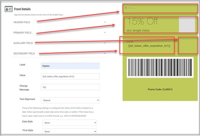 In the example below, the pass's expiration is displayed in the Secondary Field by means of a Content Token called “stl_token_offer_expiration_hr1”.