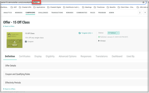 The Linked Offer section allows you to link the Wallet Pass to a specific Offer. This process is managed through the Offer ID, which can be obtained by navigating to the Offer Details screen for the desired Offer, and locating the Offer ID within the page's URL.