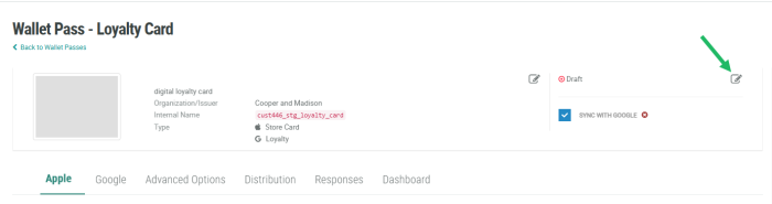 Click the desired Wallet Pass. The Wallet Pass Details screen is displayed, with the Apple tab selected by default.