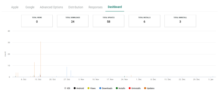 The Dashboard comprises a series of Key Performance Indicators (KPIs) across the top: Total Views, Total Installs, and Total Uninstalls (for both Google and Apple), as well as Total Downloads and Total Updates (for Apple only).