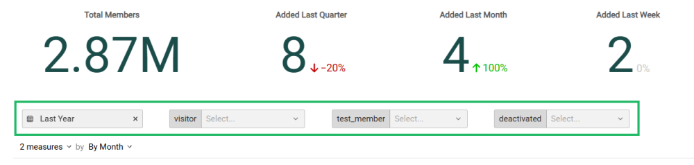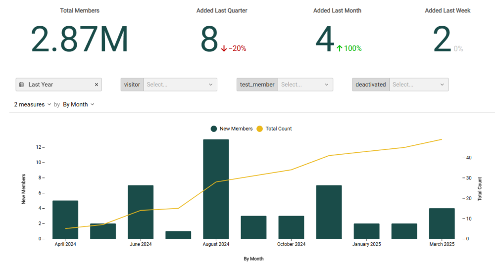 Measures: By default, the chart shows the count of new Members added within a selected time period as bars, and the total count of Members as a line. Using the Measures menu above the chart, you can toggle either of these Measures off, which removes it from the chart.