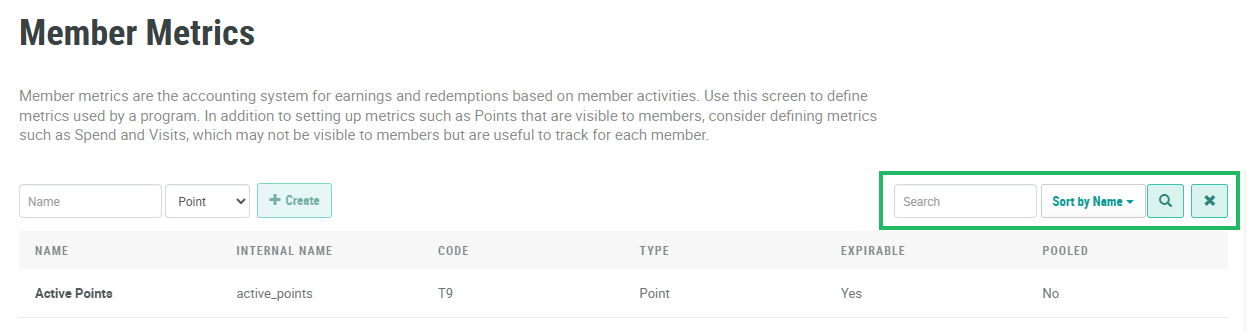 The search feature on the Member Metrics screen allows you to search for a specified text string anywhere within the Metric display name, internal name, or code.