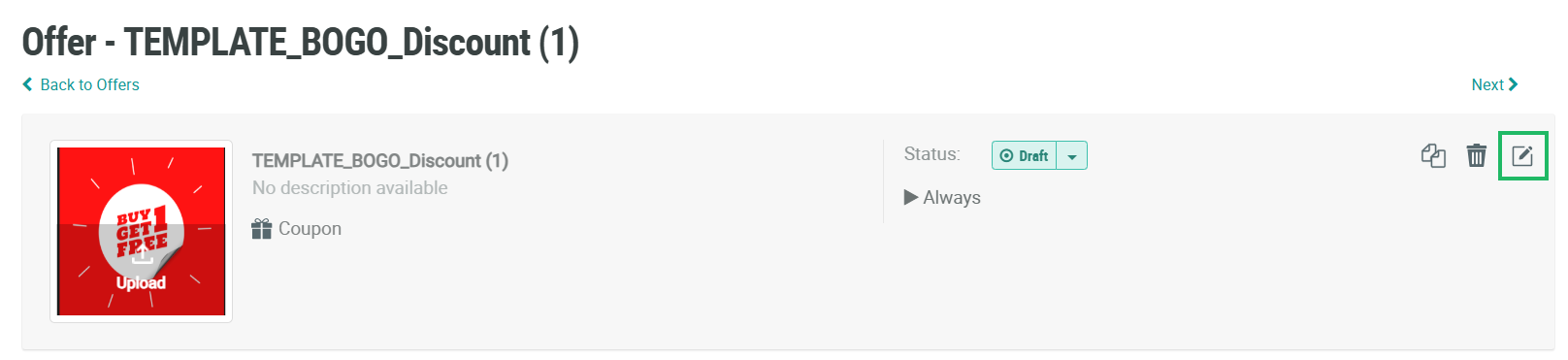 In the top-right corner of the header area, click the Edit icon. The Edit Offer pop-up window is displayed.