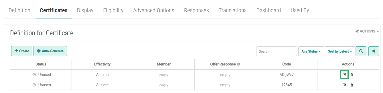 2. In the Actions column of the desired certificate code, click the Edit icon. The Edit Offer Certificate pop-up window is displayed.