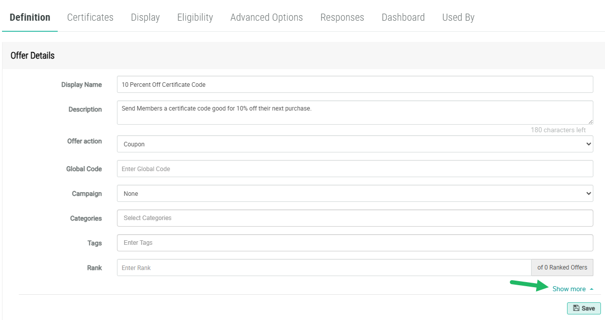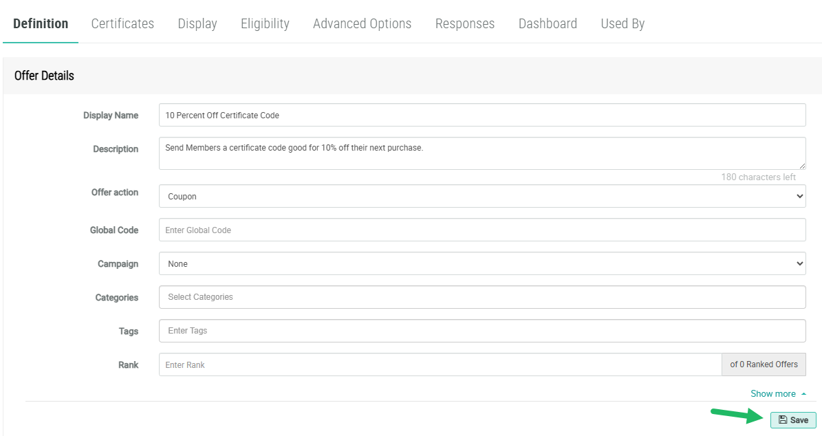 Your Offer has now been configured to present a certificate code to your Members, who can then use the code in a purchase to get 10% off.