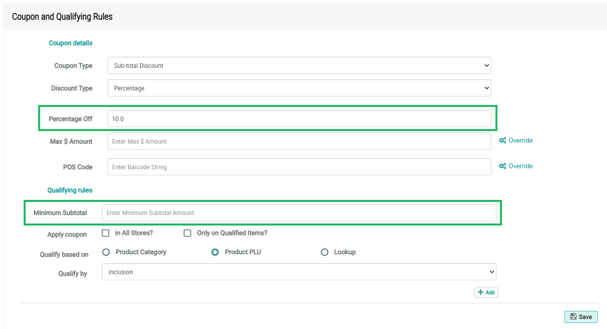 From the base template that you cloned, the Minimum Subtotal is set to 25.0. Since you don’t want to impose a minimum required purchased amount for this Offer, delete the value in this field, and leave it blank.