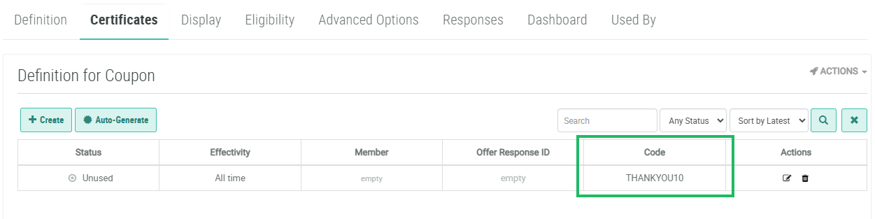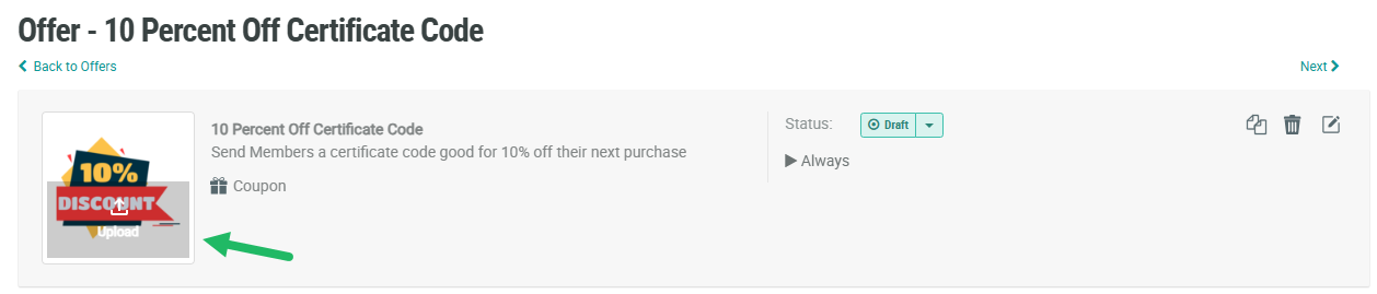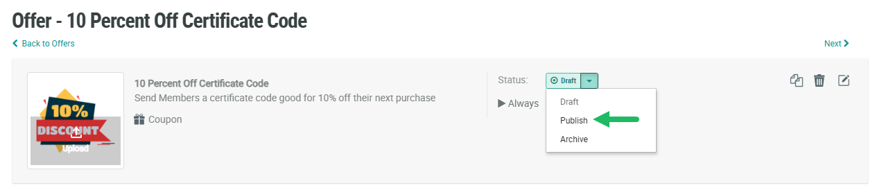 This article describes how to create a Coupon type Offer that provides a certificate code to Members. A Member can then use this code in a purchase to get a 10% discount.