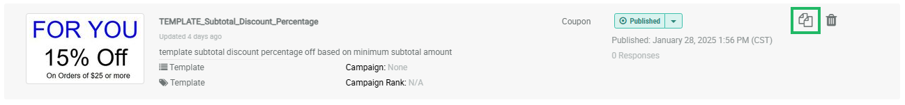 By default, Offer templates are assigned to the Template Offer Category, and assigned the Tag value of Template. Offer Categories are used to organize Offers, often for controlling what Offers get displayed on your website or app. Tags are intended to make it easier to search for the base templates within your Loyalty Essentials account. When you copy a template, the best practice recommendation is to remove these default Category and Tag assignments in the copied Offer. In the Categories field, click the X icon next to Template. Likewise, in the Tag field, click the X icon next to Template. Optionally, you can assign your own Offer Category and / or Tag value to the new Offer.