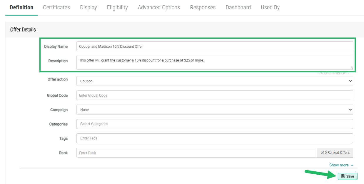 On the Definition tab, in the Offer Details section, update the Display Name to reflect your Offer purpose, and optionally enter a description in the Description field.