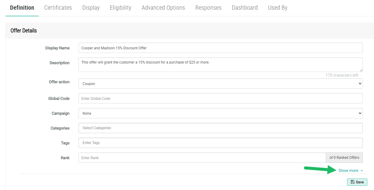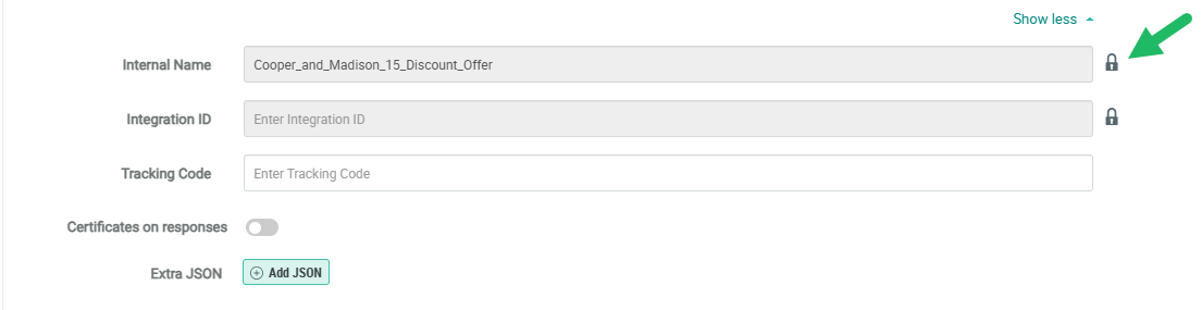 When copying an object, the recommended best practice is to update the object's Internal Name so as to avoid any duplicate name issues if you copy this object again in the future. At the bottom of the Offer Details section, click Show More to display additional fields.