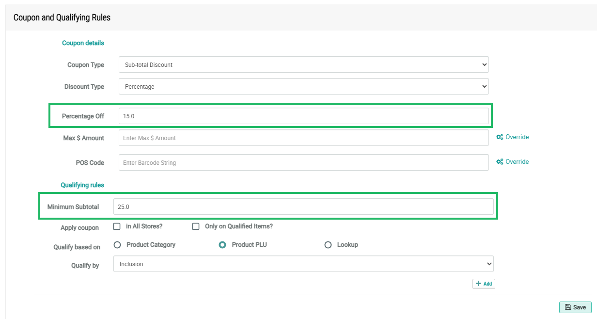 Likewise, make sure the Percentage Off is set to 15, and the Minimum Subtotal is set to 25. This configuration will give the Member a 15% discount on their purchase, but with the requirement that the order sub-total is at least $25. Smaller orders (less than $25) will not qualify for the discount.