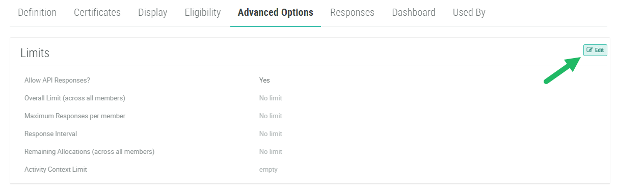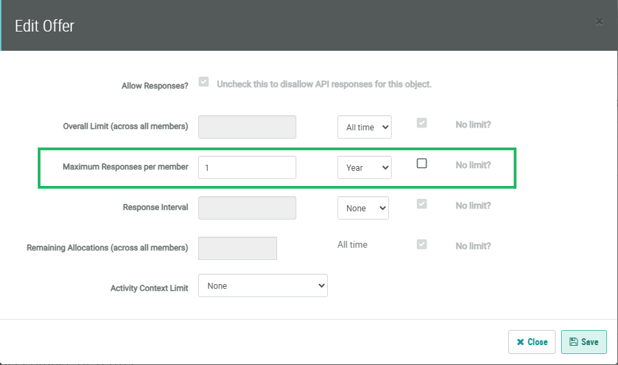 From the base template that you cloned, the Maximum Responses Per Member property is configured to No Limit. For this use case, you want to change the Offer limit to only once per year. Uncheck No Limit next to this property. Enter 1 in the text field, and select Year from the drop-down menu. With this configuration, the platform starts a one-year counter from the date the Member uses the Offer. The Member will not be able to use this Offer again until a year has elapsed.