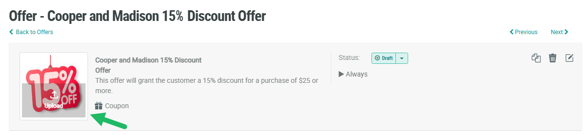 Scroll up to the Offer header area. Click into the image area, and upload a new image from your local PC.