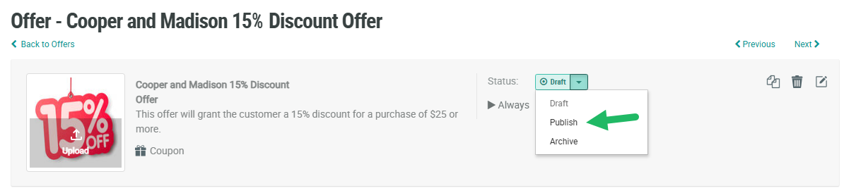 To publish the Offer, from the Status drop-down menu in the Offer header area, select Publish. A confirmation dialog box is displayed; click Confirm.