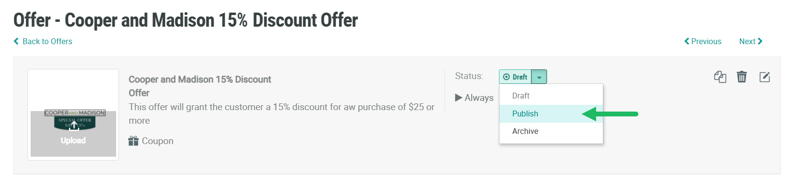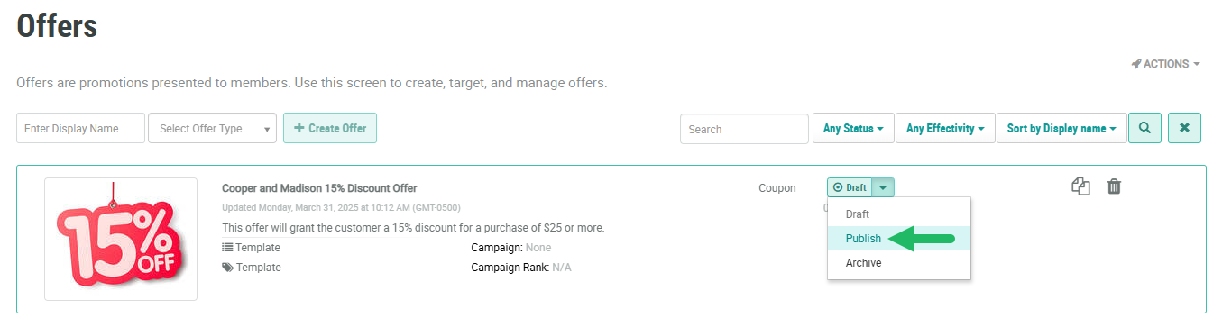 For an Offer to be considered live and usable within the platform, it must have a status of Publish.