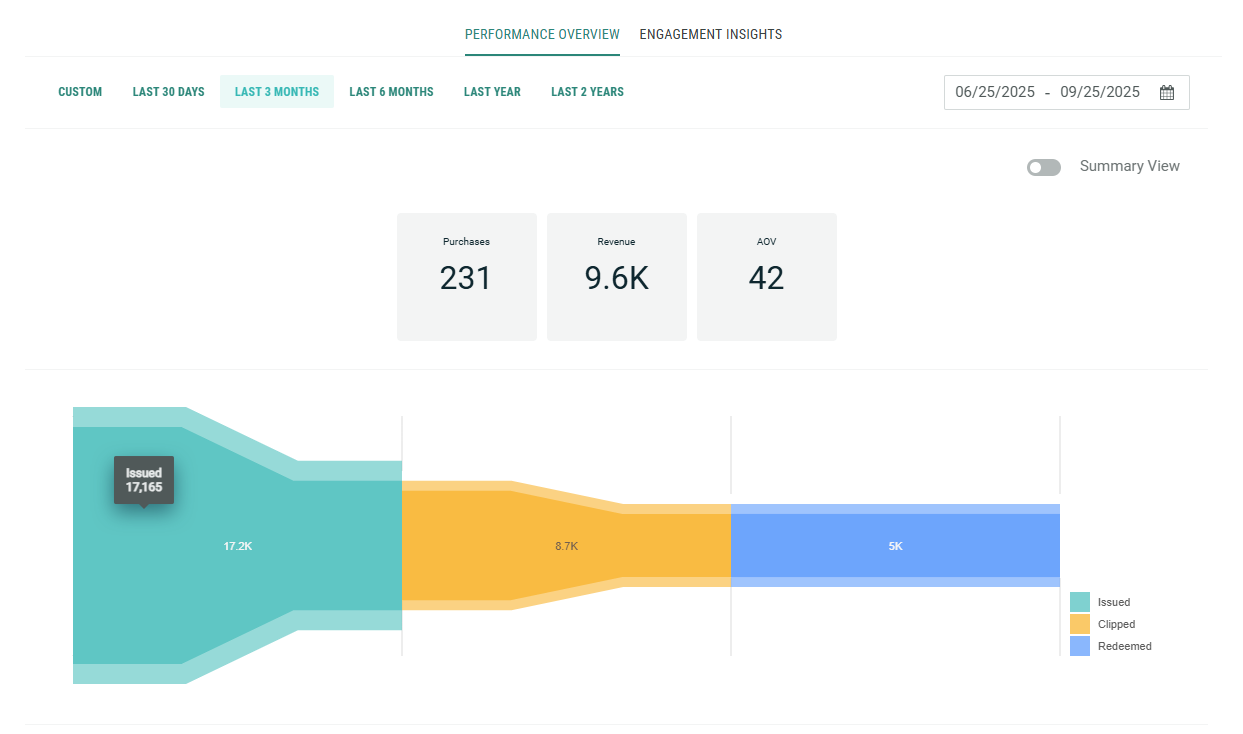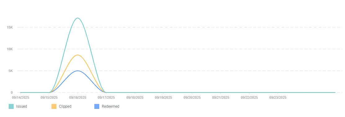 Beneath the funnel graph, the Performance Overview uses a line graph to depict the number of Issued, Clipped (if used), and Redeemed Offers over the course of the selected reporting period. This report is designed to show Offer usage trends over time.