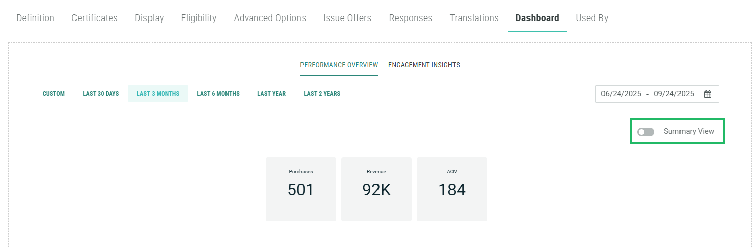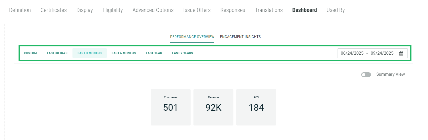 The Offer Lift Analysis Dashboard is separated into two main reports: Performance Overview and Engagement Insights. These reports are accessible by clicking the desired option near the top of the Dashboard tab.