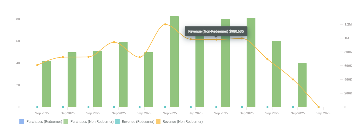 Beneath the table, the report displays a combination graph. The lines in the graph depict Revenue for Redeemers and Non-Redeemers over the reporting period. The bars in the graph depict Purchases for Redeemers and Non-Redeemers over the reporting period.