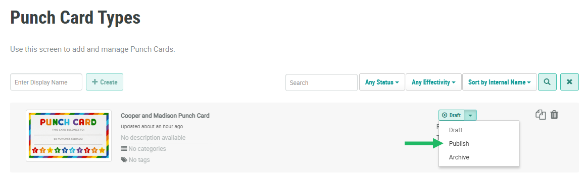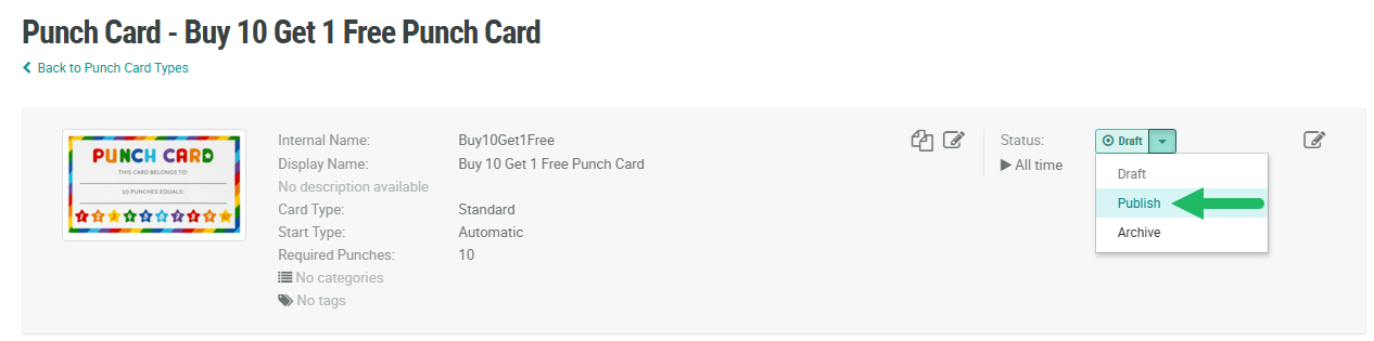 For a Punch Card to be considered live and usable within the Loyalty platform, it must have a status of Publish.