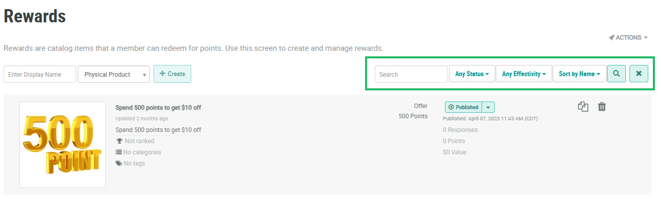 The search feature on the Rewards screen allows you to search for a specified text string anywhere within several commonly-used Reward fields, including name, tag, and Reward Category. You can also filter the Rewards screen to show only Rewards with a specified status or effectivity range.