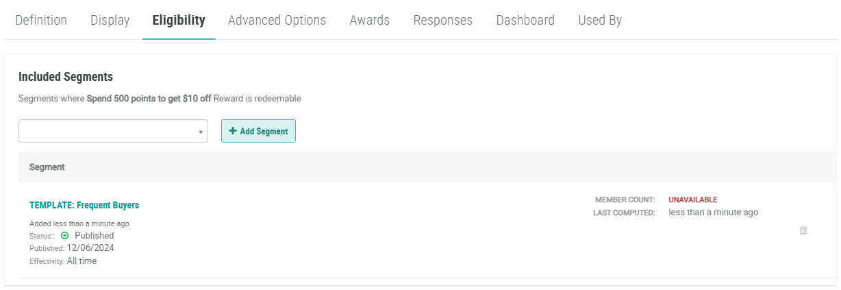 1. Click Add Segment. The selected Segment is displayed within the Excluded Segments section. If you add both an Included Segment and an Excluded Segment to the Reward, the Excluded Segment takes priority. Therefore, if a Member is selected by both the Included and the Excluded Segment, that Member will be ineligible for this Reward.