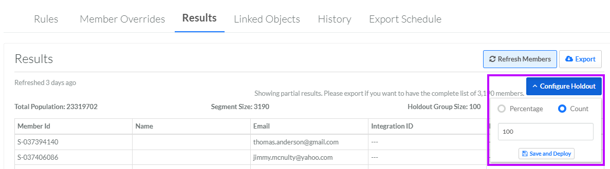 2. Click Refresh Members again. The platform again executes the Segment logic to select Members, including randomly assigning Members to the Holdout Group.