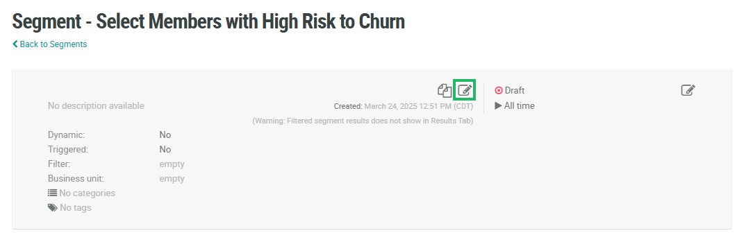 Many of the high-level properties of the Segment (such as the name, description, tag, category, etc.) are accessible from the Edit Segment pop-up window. To change the high-level properties of this Segment: