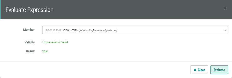 The platform displays the results. The Validity field indicates if the platform encountered any errors in the expression syntax or logic. The Result field displays True if the Member was selected by the Segment, and False if they were not selected by the Segment.