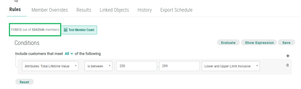 After defining the Rules for your Segment, you can run a quick test to see how many Members the logical conditions will select. This feature is a useful method to validate that the Segment logic is working, and that it is selecting the expected number of Members.