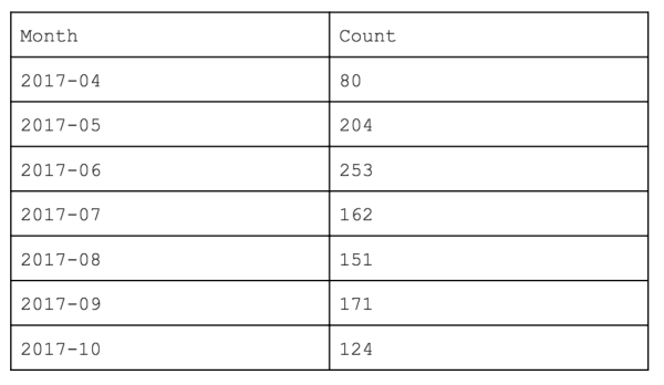 SELECT (TO_CHAR(member_since, 'yyyy-MM')) AS Month, COUNT(1) AS Count FROM MEMBER_TABLE WHERE in_period(member_since, 'PERIOD') = true GROUP BY Month |