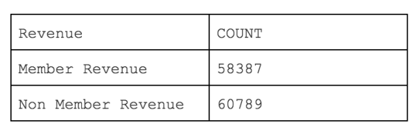 SELECT * FROM (SELECT 'Member Revenue' AS "Revenue", ROUND(SUM(sl_subtotal),2) AS "Count" FROM ACTIVITY_TABLE WHERE sl_type = 'sl_purchase' AND in_period(sl_activity_ts, 'PERIOD') = true AND (NOT sl_member_id is NULL) UNION ALL SELECT 'Non Member Revenue' AS "Revenue", ROUND(SUM(sl_subtotal),2) AS "Count" FROM ACTIVITY_TABLE WHERE sl_type = 'sl_purchase' AND in_period(sl_activity_ts, 'PERIOD') = true AND sl_member_id is NULL) |