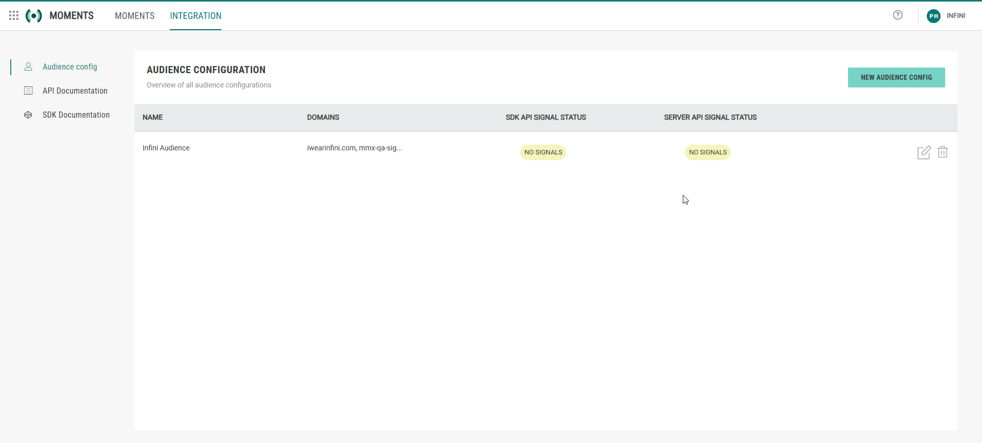 Audience Configuration plays a key role in your Marigold Moments setup. For websites, it specifies which domains should be monitored for incoming signals using the SDK or API keys. It also maps those signals to a specific audience in your marketing environment, ensuring each triggered Moment is linked to the correct user or profile.