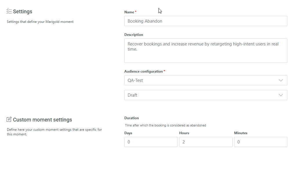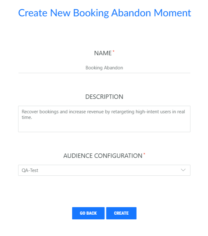 First create the Booking Abandon Moment and fill out the name, description and select the Audience configuration to apply to this Moment.