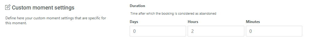 Example: At 14h, a customer starts a booking. An hour later the booking has not been completed yet and the Booking Abandon Moment is triggered.