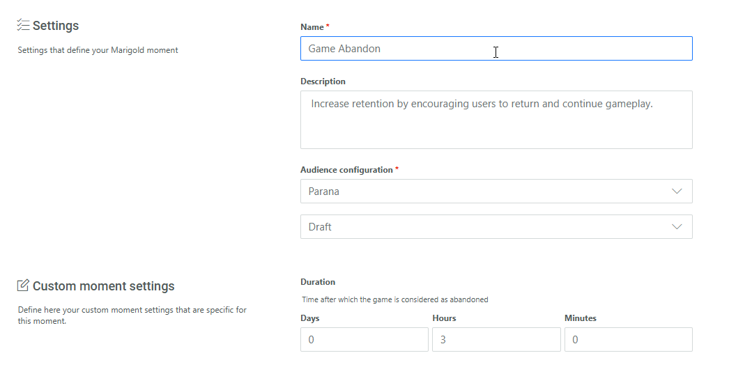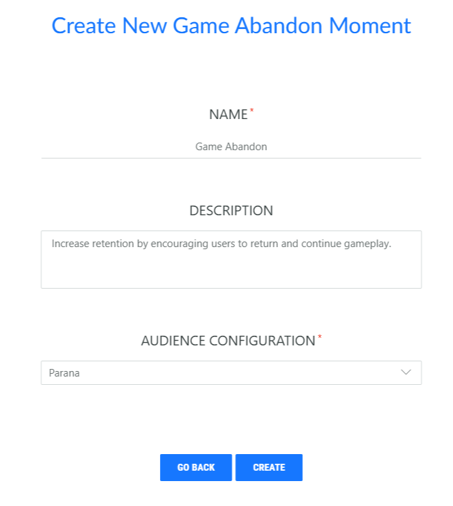 First create the Game Abandon Moment and fill out the name, description and select the Audience configuration to apply to this Moment.